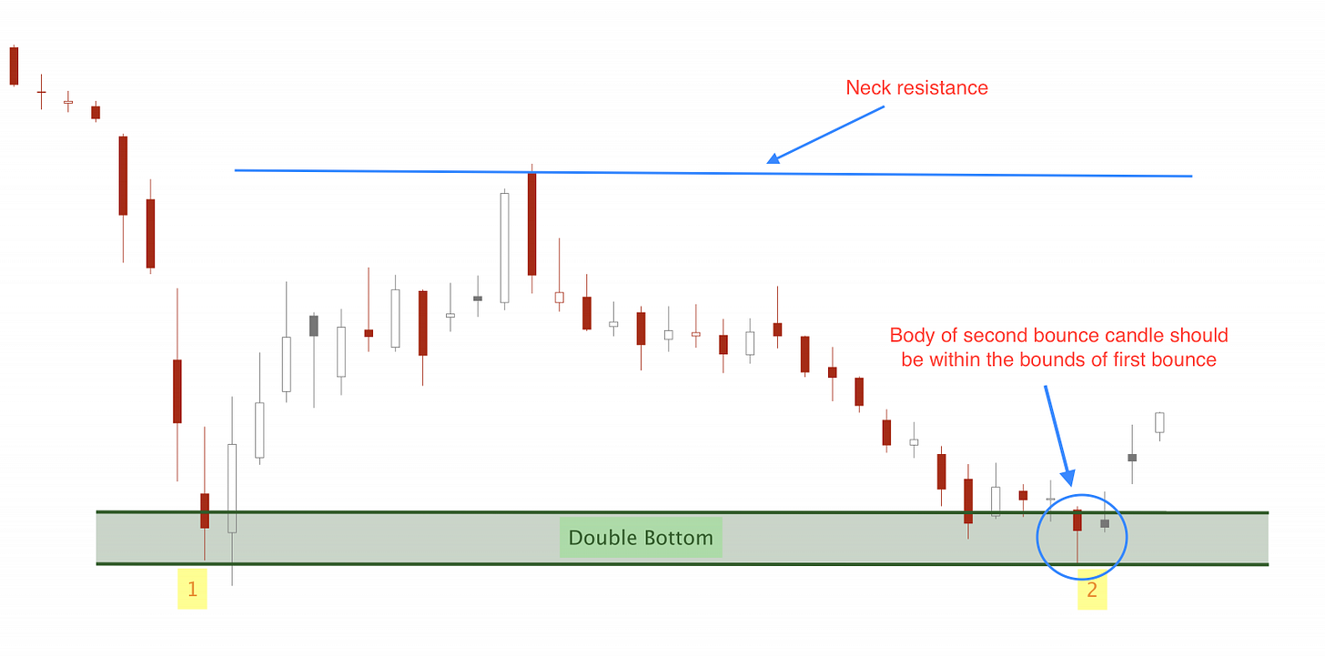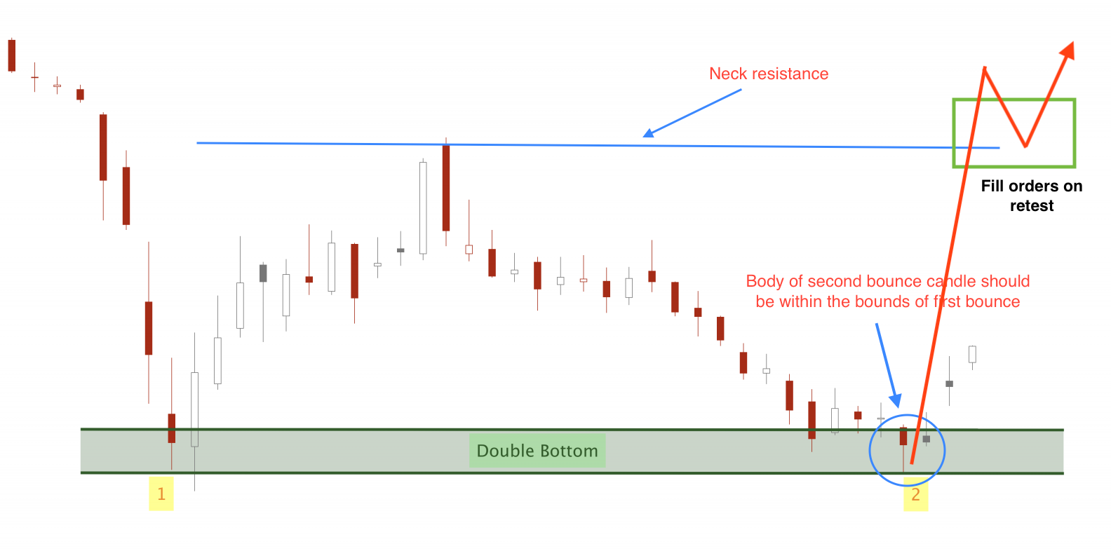 On larger time frames like daily and weekly, double bottom works best with more distance between the two bottoms the better.